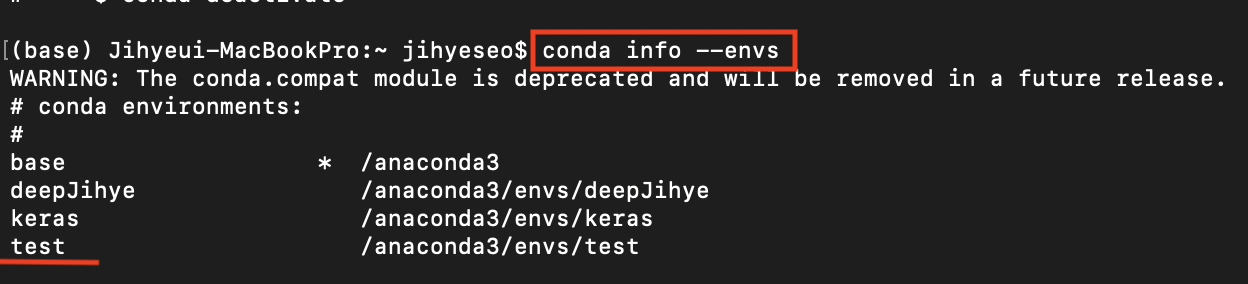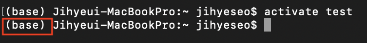 앞에 (base) 가 여전히 base로 되어있는건 test 가상환경이 실행되지 않았다는 뜻입니다.