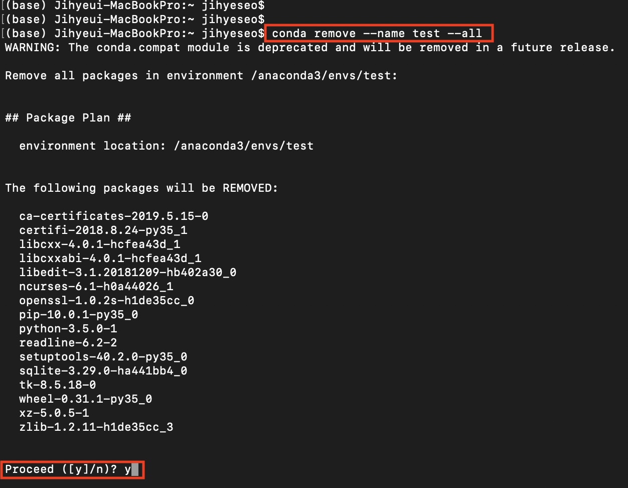 예시 > conda remove --name test --all