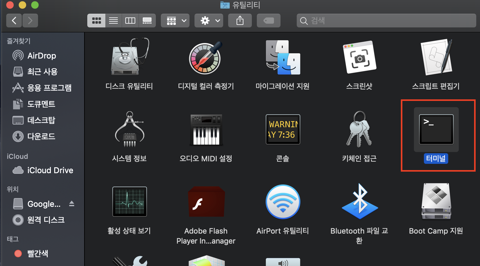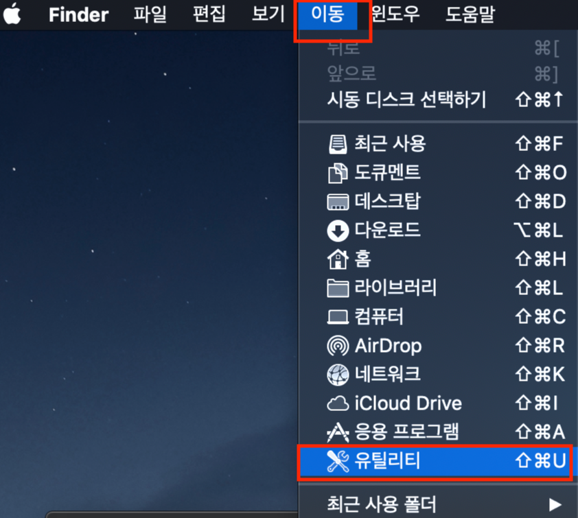 맥북 터미널 실행 : 배경화면 클릭 > 좌측 상단 이동 > 유틸리티 > 터미널 실행