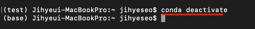 위의 명령어를 입력하면, 현재 활성화 되어있는 가상환경에서 다시 (base)로 나오게 됩니다.