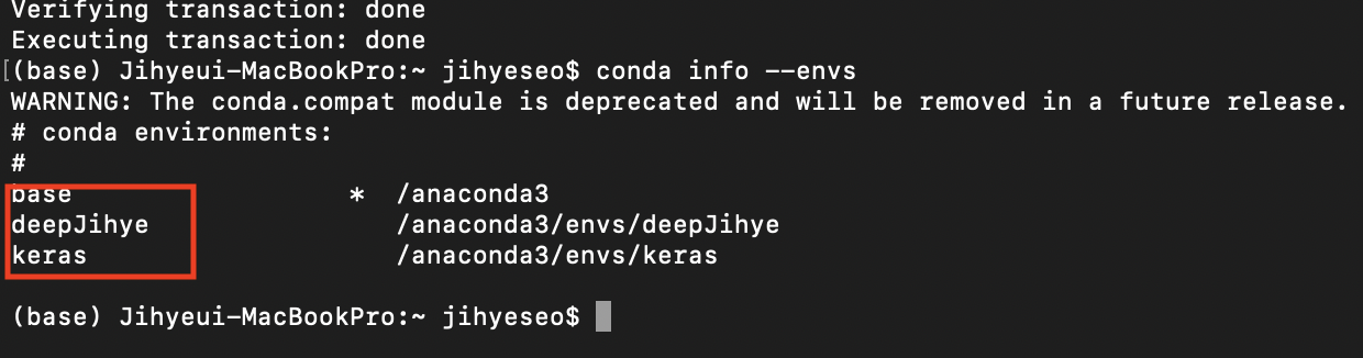 위의 명령어를 입력하면, 현재 활성화 되어있는 가상환경에서 다시 (base)로 나오게 됩니다.