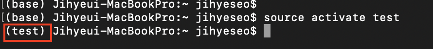 앞에 (base) 가 여전히 base로 되어있는건 test 가상환경이 실행되지 않았다는 뜻입니다.