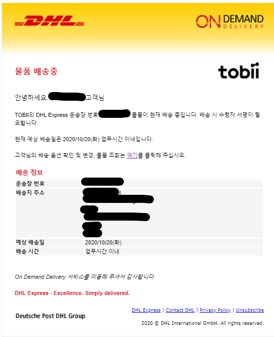 그리고 배송 업체인 DHL에 물건이 넘어가게되면 배송안내 내용이 메일로 전달됩니다.