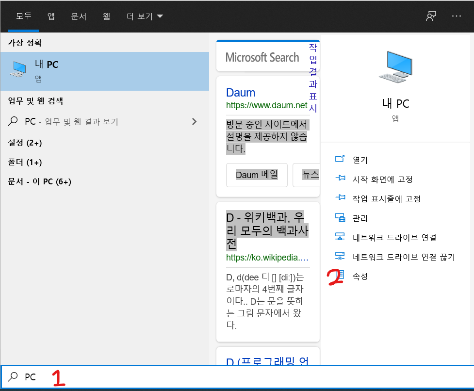윈도우 버튼을 누르고 "PC"라고 검색하면