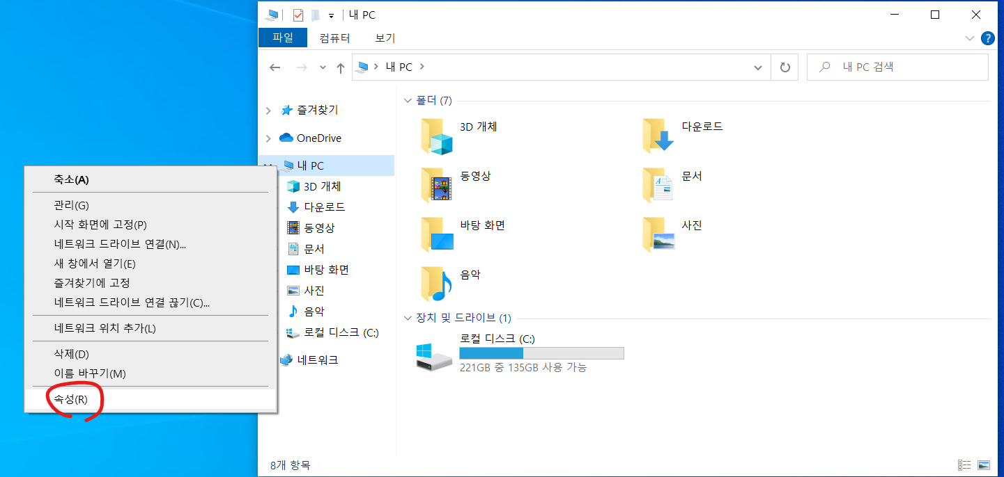 내 PC 를 우클릭하면 속성 메뉴가 나옵니다.