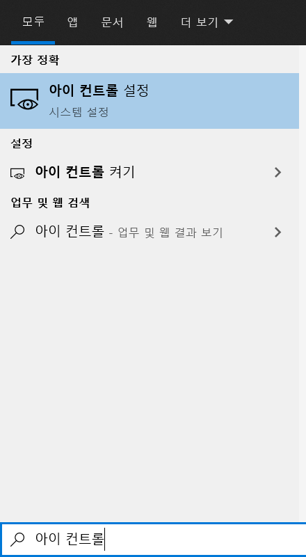 3번 앱 설치 할때처럼 윈도우를 클릭하고 "아이 컨트롤 설정" 을 검색하고 클릭해 주세요.