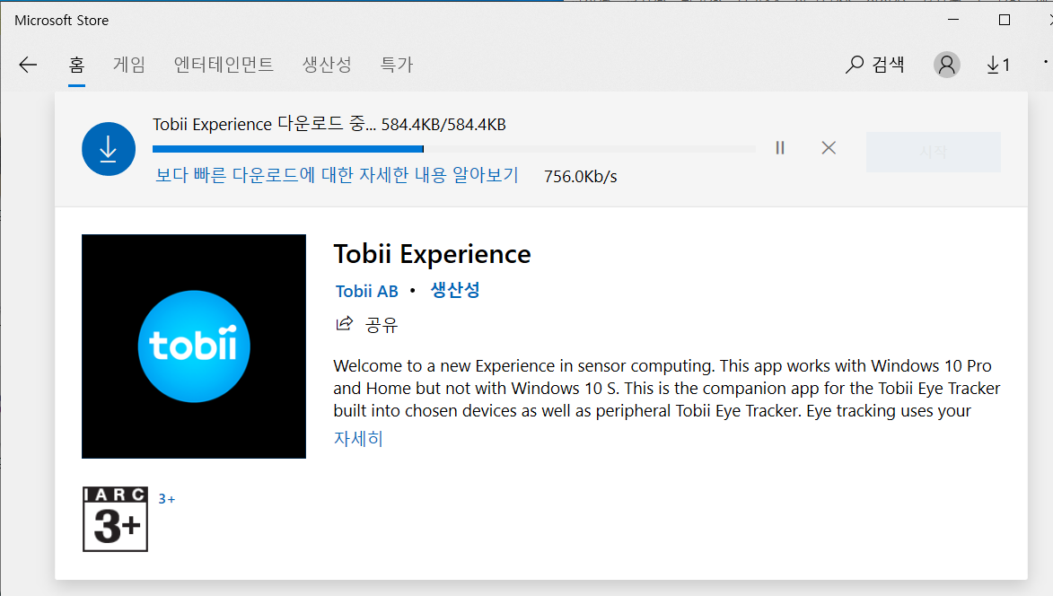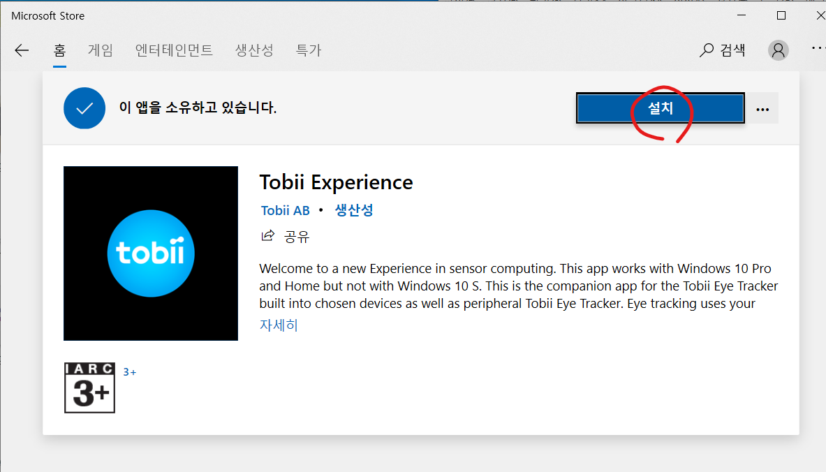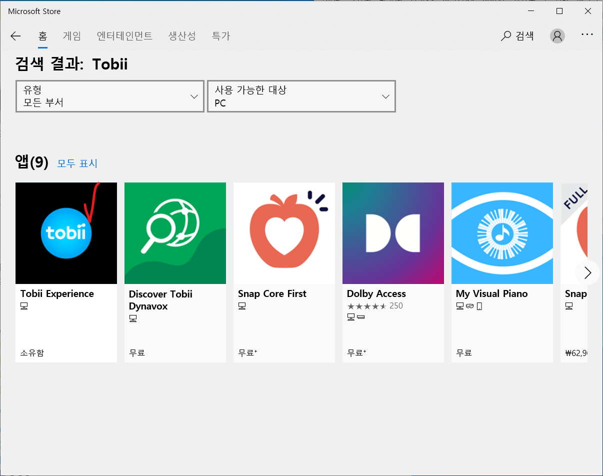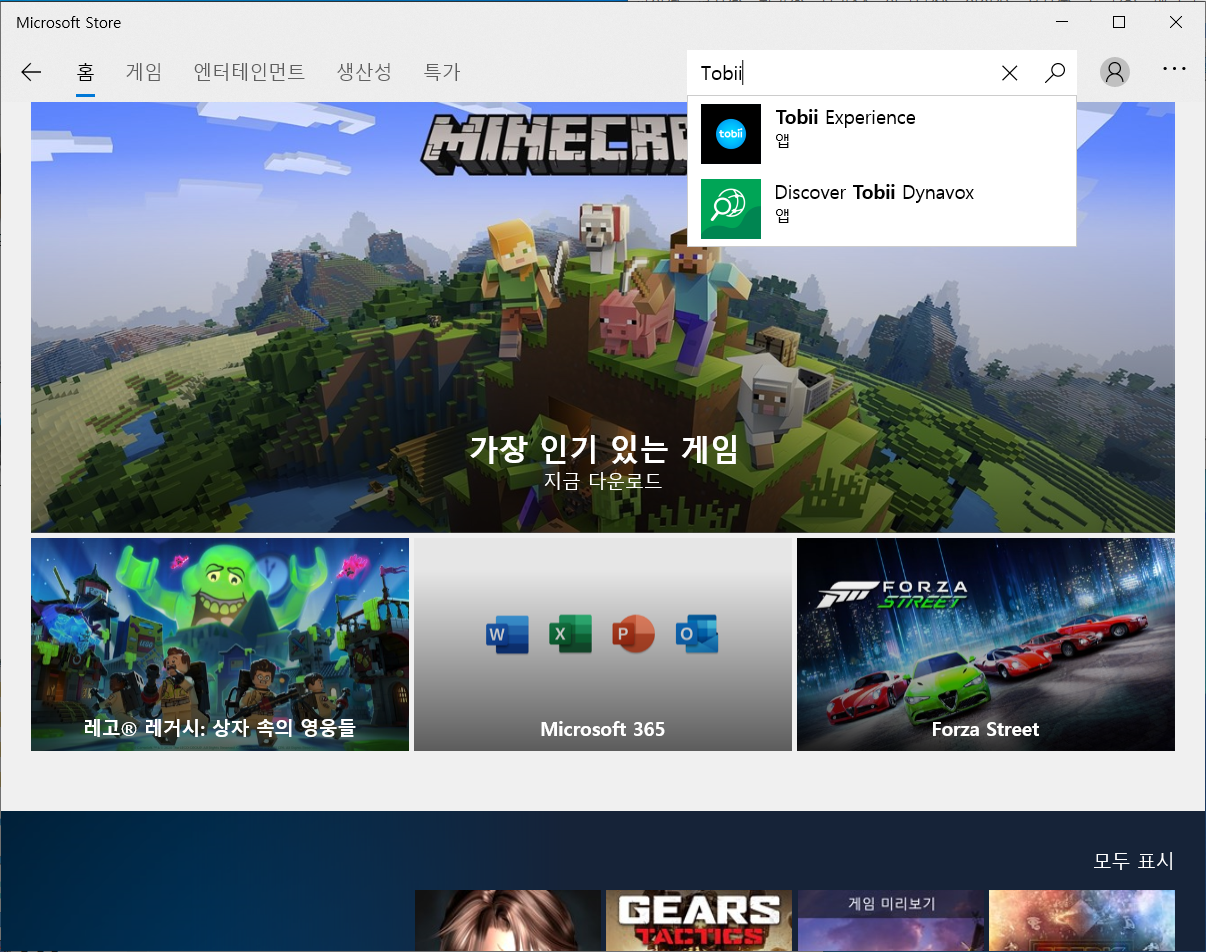 Microsoft store 를 열면 오른쪽 위 검색창에 "tobii"를 검색합니다.
