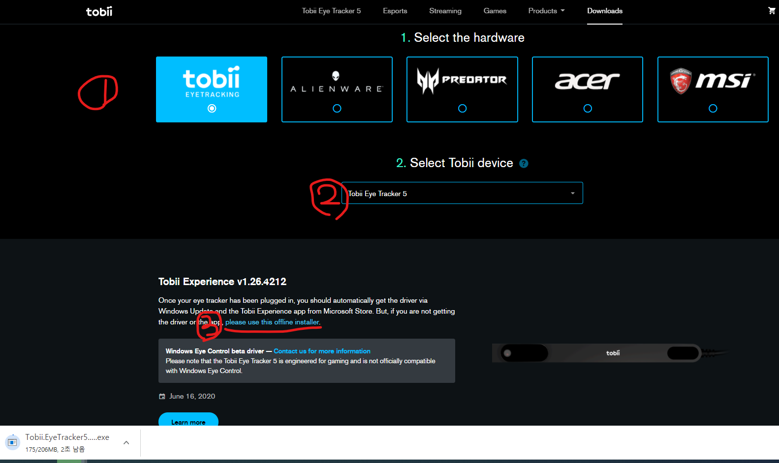① 토비 선택 >> ② 구매한 토비 제품 선택 >> ③ please use this offline installer 클릭