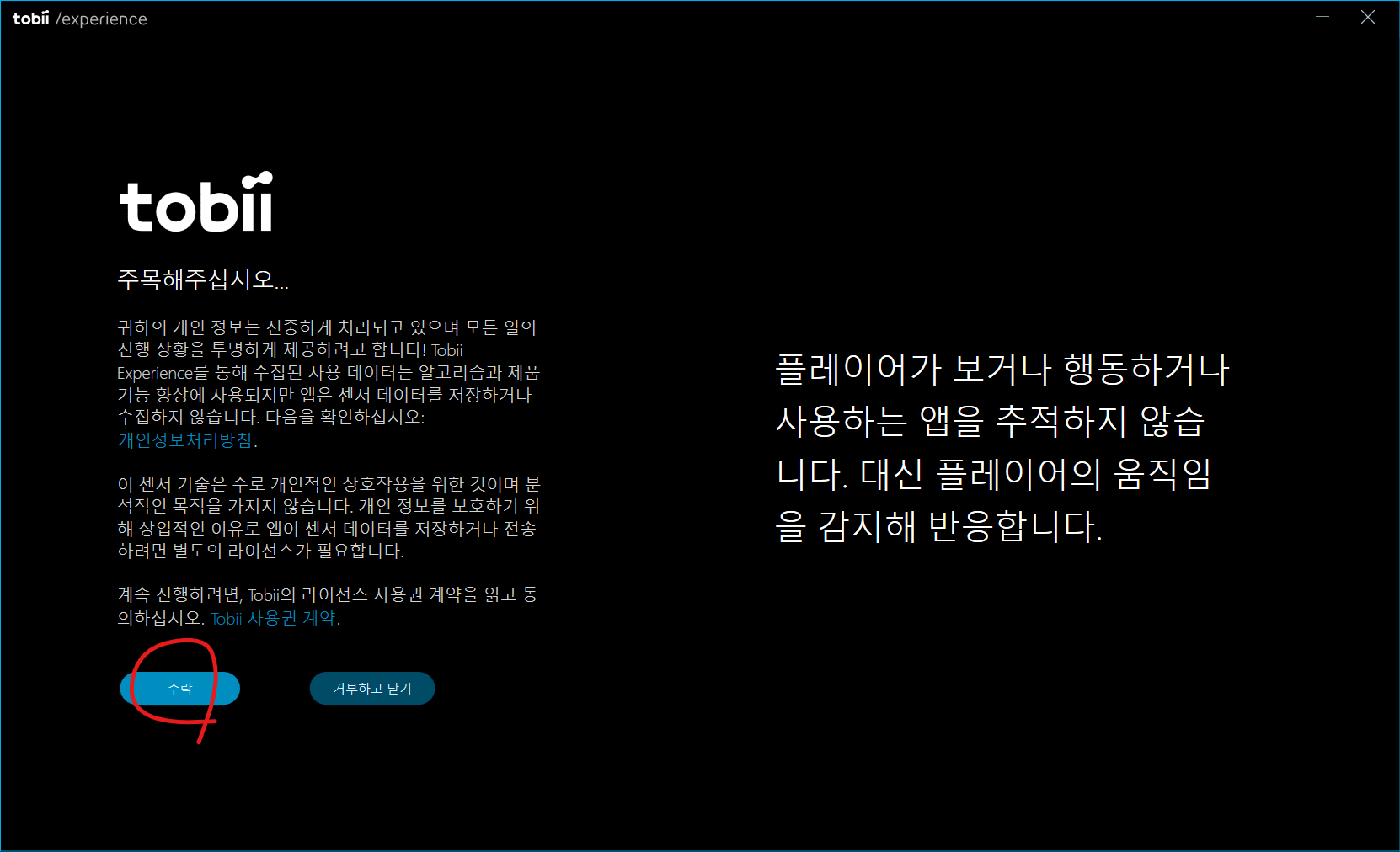 컴퓨터에 설치된 tobii 프로그램을 완전히 삭제하신 후 진행하셔야합니다.