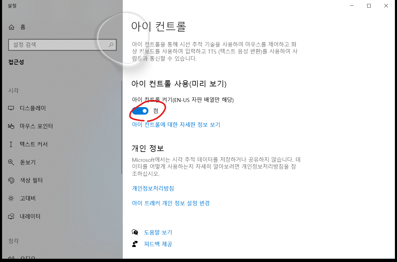 offilne installer 설치 > Microsoft store 에서 tobii 설치 > 드라이버 설치 > 아이컨트롤러 설정
