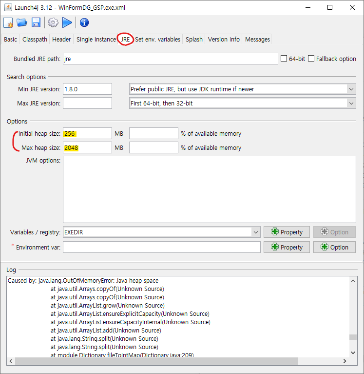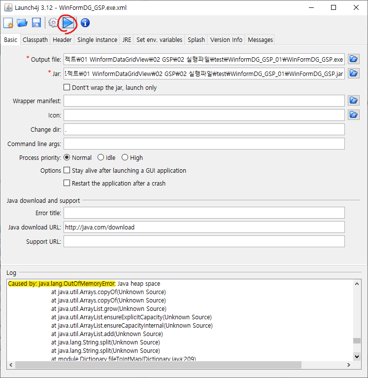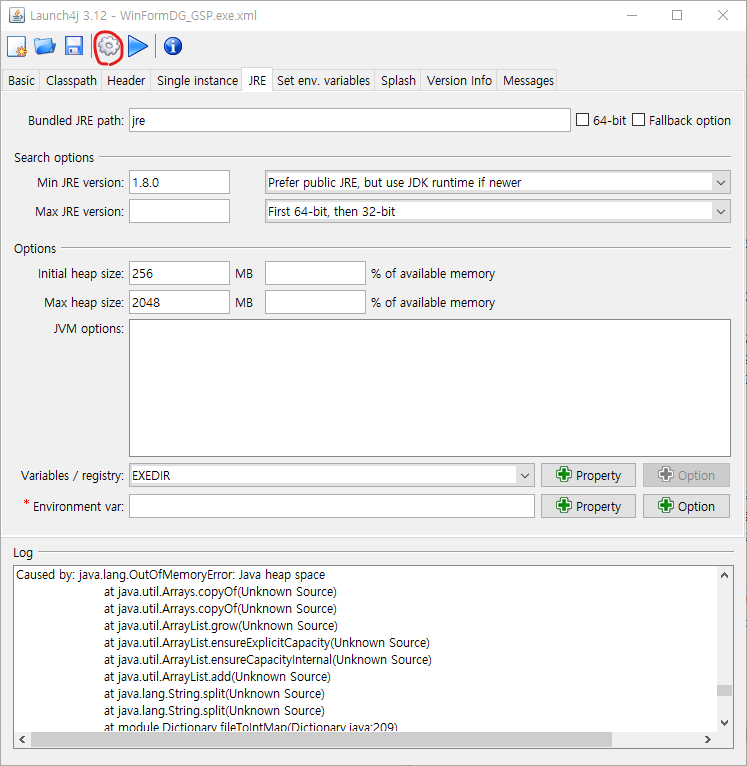 다시 실행파일을 만들어서 에러를 확인했던 launch4j 로 돌아와