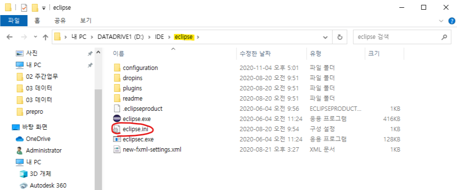 각자 자신의 이클립스 설치 경로에서 eclipse.ini 파일을 열어보자.