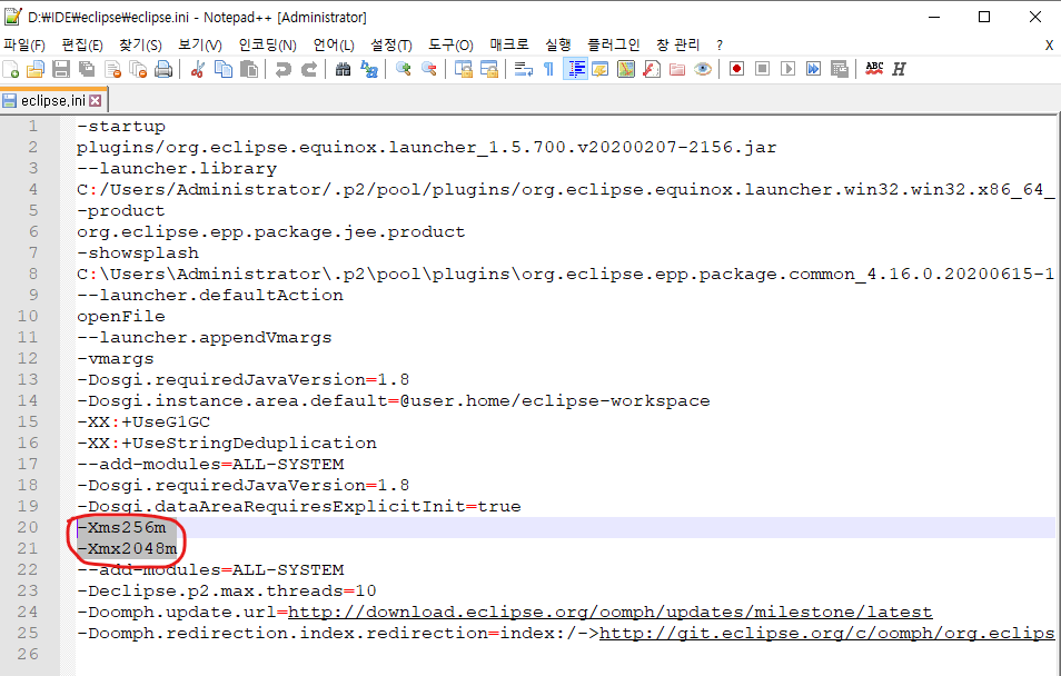 notepad++ 에디터로 파일을 열어서 메모리 설정 값을 확인한다.