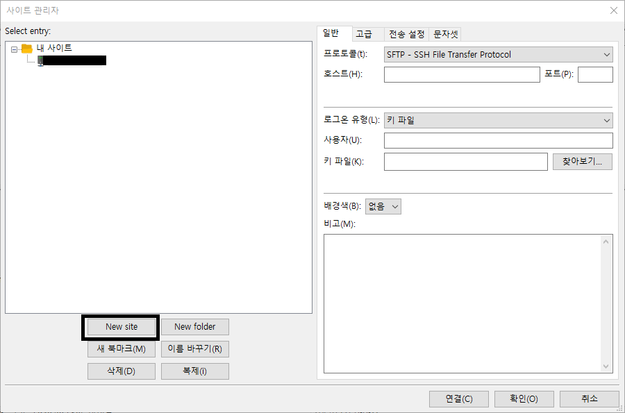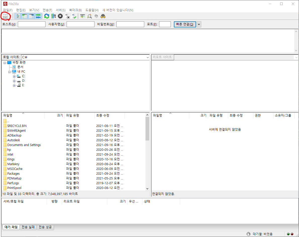 설치된 파일질라를 실행 시키면 뜨는 창 왼쪽 상단에 버튼을 클릭.