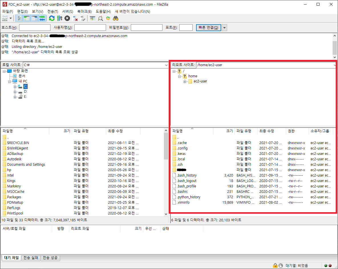 성공적으로 연결이되면, 우측에 EC2 인스턴스의 폴더, 파일 구조들을 조회, 생성, 이동할 수 있다.