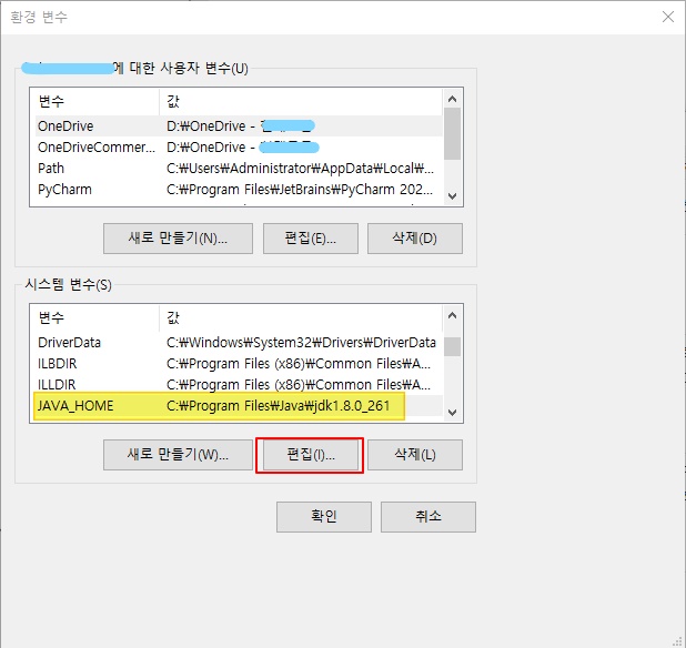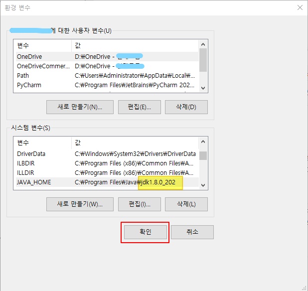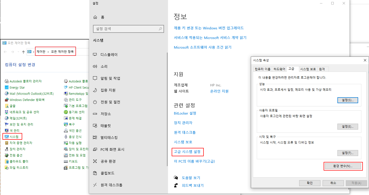 1. 제어판 > 모든 제어판 항목 > 시스템 > 고급 시스템 설정 > 고급 탭 > 환경 변수 클릭