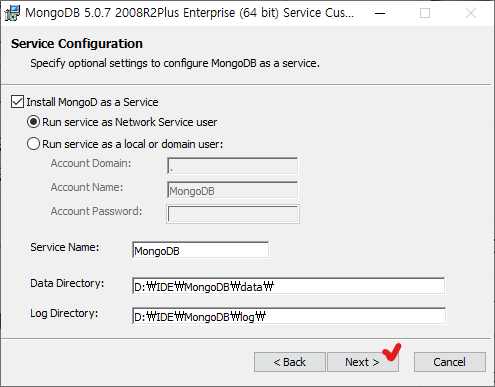 필요하지 않으면 Install MongoDB Compass 에 체크를 해제하면 된다.