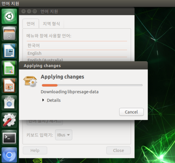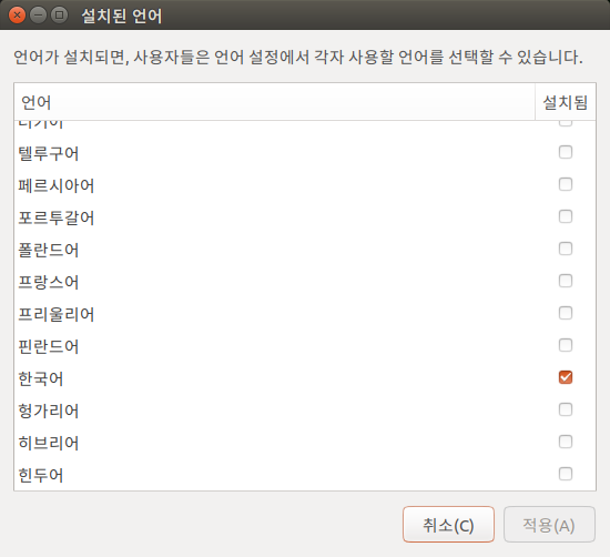 2) 한국어 체크 (Korean 으로 표기되어있을 수도 있습니다) > 적용