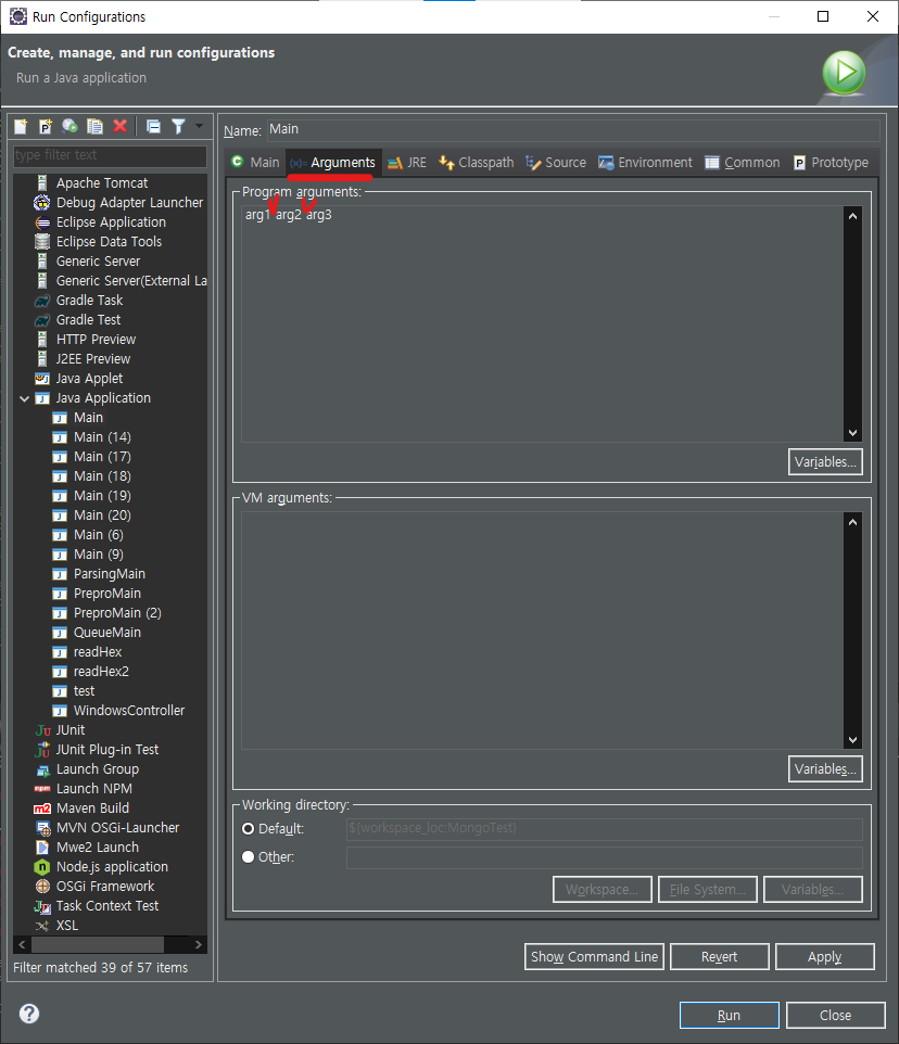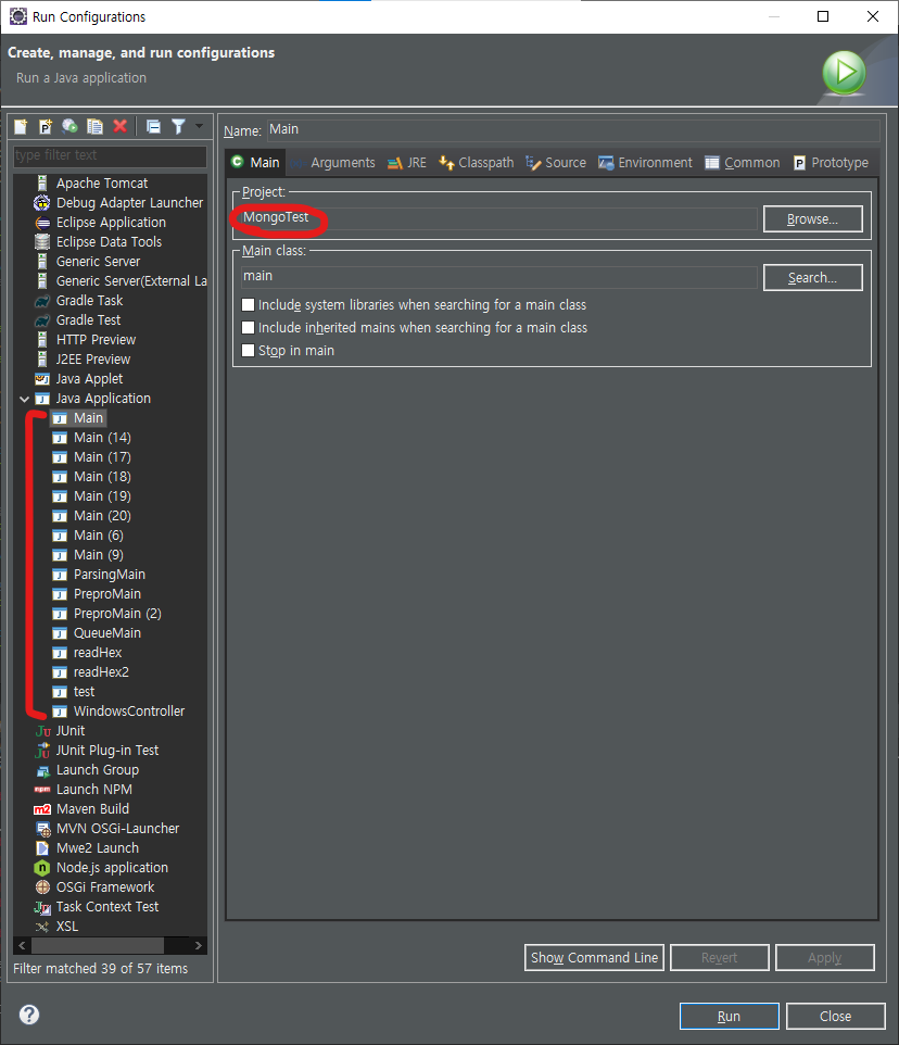 왼쪽 메뉴에서 Java Application 하위에 Main 들을 클릭해보면서