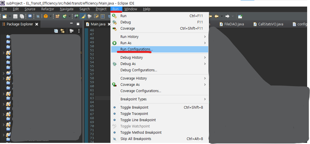 그 중에 java 어플리케이션 실행 환경 설정이 가능한 Run Configurations...창을 열어준다.