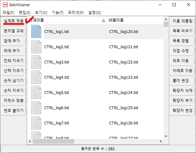 왼쪽에는 현재 파일 이름, 오른쪽은 바뀔 이름이 나타나 있습니다.