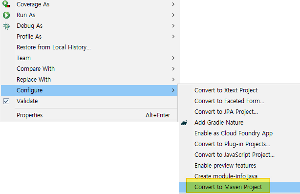 1. 메이븐 프로젝트로 변경 : 프로젝트 우클릭 → Configure → Convert to Maven Project
