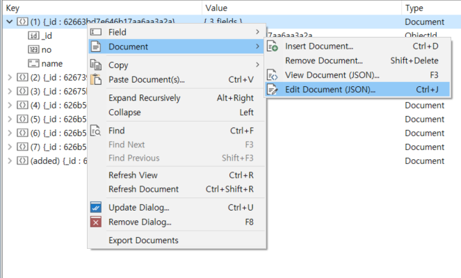 데이터를 수정하고 싶으면 해당 데이터(document)에 우클릭 > Document > Edit Document (JSON) 에 들어가