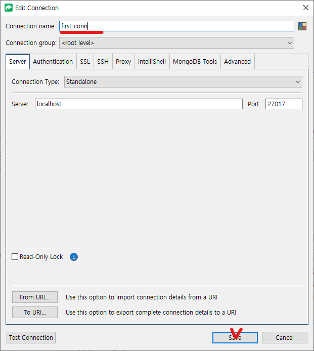 New Connection을 따로 등록하지 않아도 설치된 몽고디비가 디폴트로 리스트에 있었던 것 같다.
