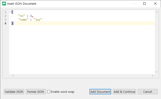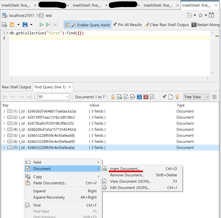Find Query 탭 > 빈공간 우클릭 > InsertDocument