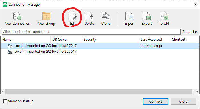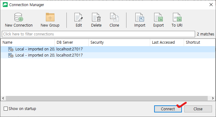 New Connection을 한번 더 눌러서 두개가 이지만, 두개가 같은 몽고디비이다.