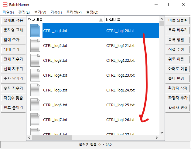왼쪽에는 현재 파일 이름, 오른쪽은 바뀔 이름이 나타나 있습니다.